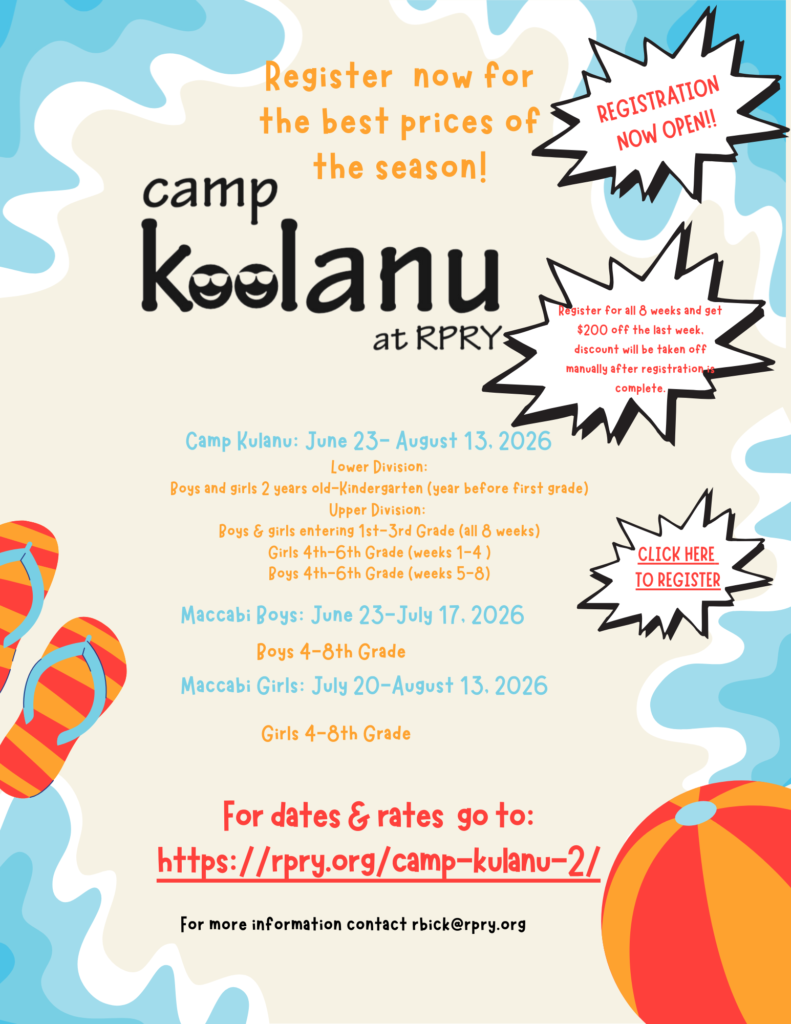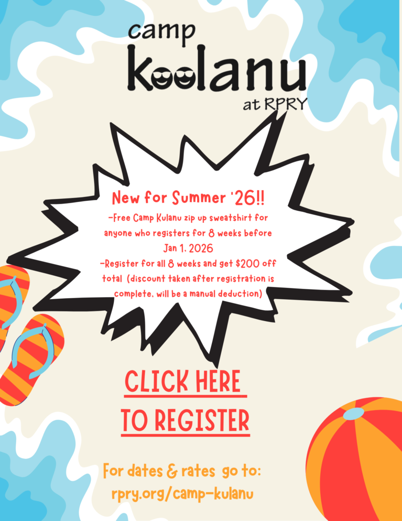 Camp Kulanu at RPRY offers a summer of non-stop, innovative, educational and inspirational fun, for children aged 18 months – girls in 4th-6th grade- 1st session, and boys 4th and 5th grade- second session.